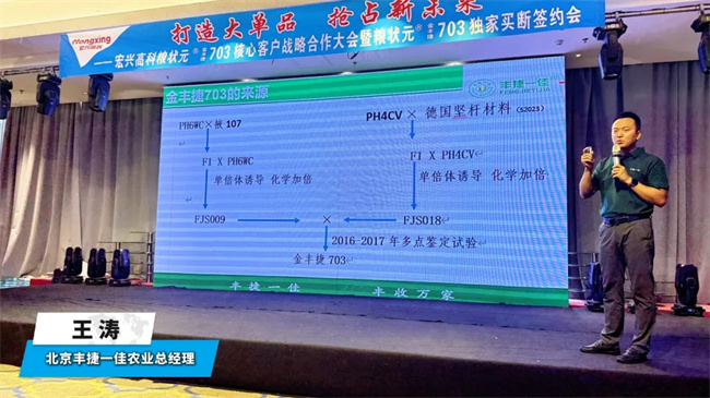 簽約儀式上,北京豐捷一佳王濤經(jīng)理詳細介紹了糧狀元®金豐捷703品種選育背景、特征特性和應(yīng)用前景及轉(zhuǎn)基因版進展,系統(tǒng)總結(jié)了糧狀元®金豐捷703試驗情況。
