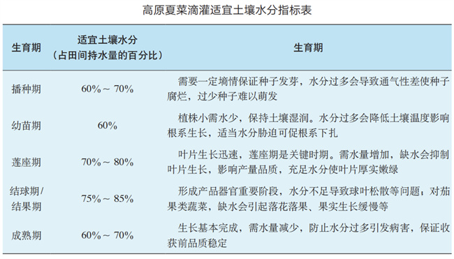 幼苗期,植株較小,需水量相對較少,保持土壤濕潤即可,一般每隔3~5天滴灌一次,每次滴水量為5~8米³/畝,避免土壤過濕導(dǎo)致根系缺氧或發(fā)生病害;蓮座期和結(jié)果期,蔬菜生長旺盛,需水量增大,應(yīng)適當(dāng)增加灌水量和灌溉頻率,每隔3~5天滴灌一次,每次滴水量為8~12米³/畝,使土壤濕潤深度達(dá)到30~40厘米,以滿足植株生長對水分的需求,但也要注意防止土壤濕度過大,引發(fā)根部病害和植株徒長。