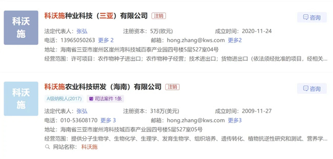 此外,科沃施農(nóng)業(yè)科技研發(fā)(海南)有限公司、科沃施種業(yè)科技(三亞)有限公司狀態(tài)均顯示為“注銷”,北京科沃施農(nóng)業(yè)技術(shù)有限公司仍處于“開業(yè)”狀態(tài)。