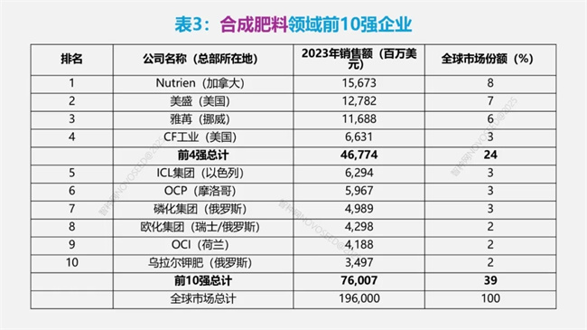 在合成肥料領(lǐng)域,全球市場價值達 1960 億美元,前十大公司控制了 39%的市場份額,其中 Nutrien、Mosaic 和 Yara 等公司占據(jù)主導(dǎo)地位。