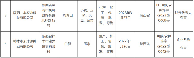 根據(jù)《中華人民共和國(guó)種子法》《農(nóng)作物種子生產(chǎn)經(jīng)營(yíng)許可管理辦法》和《植物新品種保護(hù)條例》等有關(guān)規(guī)定,經(jīng)省農(nóng)業(yè)農(nóng)村廳核查,現(xiàn)批準(zhǔn)核發(fā)2025年第二批《農(nóng)作物種子生產(chǎn)經(jīng)營(yíng)許可證》,持證企業(yè)為漢中市瑞豐生物科技有限責(zé)任公司、陜西奧瑞豐現(xiàn)代種業(yè)有限公司、陜西九豐農(nóng)業(yè)科技有限公司、神木市禾灃源種業(yè)有限公司(詳見附件)。
