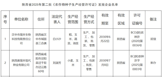 附件:陜西省2025年第二批《農(nóng)作物種子生產(chǎn)經(jīng)營(yíng)許可證》發(fā)放企業(yè)名單