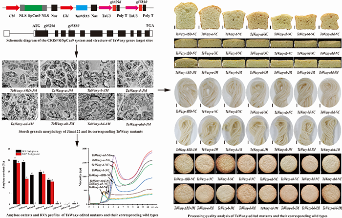 科研團(tuán)隊(duì)前期研究證實(shí)TaWaxy基因表達(dá)量可直接影響直鏈淀粉含量。隨后該團(tuán)隊(duì)利用基因編輯技術(shù)構(gòu)建了高效基因編輯載體,并成功對(duì)我國(guó)主栽小麥品種“濟(jì)麥22”和“寧春4號(hào)”的TaWaxy基因進(jìn)行編輯,獲得了7種無(wú)轉(zhuǎn)基因元件的突變體,其直鏈淀粉含量均低于對(duì)照品種,最低可降低至0%,并表現(xiàn)出典型糯小麥特性。進(jìn)一步分析表明,2個(gè)突變體分別表現(xiàn)出更好的面條及餅干加工品質(zhì)。該研究為專用小麥品種的定向改良提供了重要的理論基礎(chǔ)和材料支撐。