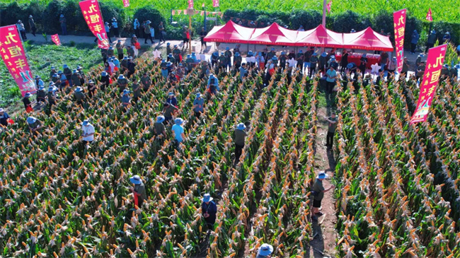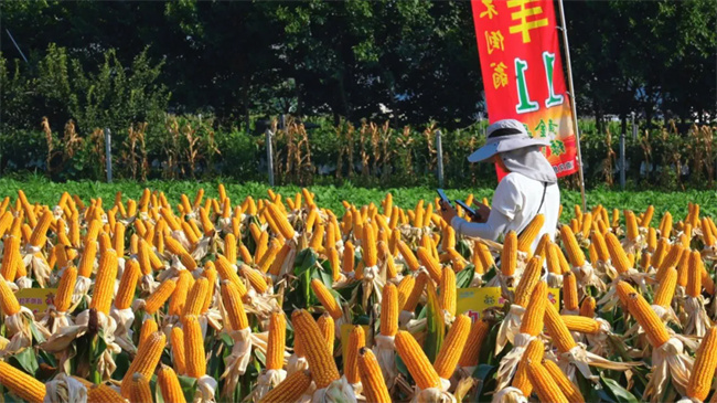 黃金粒不倒翁“九恒豐11”玉米品種是久恒農(nóng)業(yè)采用熱帶資源與堅稈抗倒基因培育而成的高產(chǎn)、多抗型創(chuàng)新品種。在觀摩會現(xiàn)場,大田里金燦燦的果穗呈現(xiàn)出一派豐收景象,令觀摩嘉賓們贊嘆不已。在5000株/畝的種植密度下,九恒豐11棵棵有棒,棒棒均勻,穗子整齊,結(jié)實良好。尤其在2025年特殊的氣候條件下,這一品種的優(yōu)異表現(xiàn)更是顯得難能可貴,贏得了觀摩嘉賓的高度贊譽。