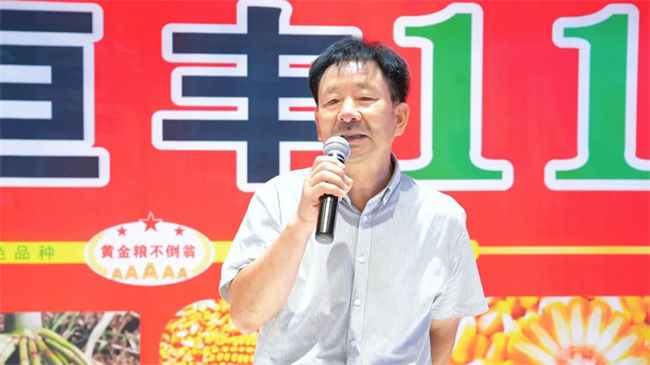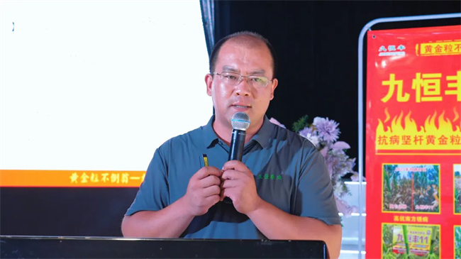 臨潁縣代理商范總在分享中稱贊九恒豐11抗病、堅稈、黃金粒,更抗倒,耐旱耐澇等特點,認(rèn)為這些特性將使其在當(dāng)?shù)厥袌龈吒偁幜?。商丘代理商郭總則從大田表現(xiàn)角度分享了九恒豐11的抗倒性強、抗病性優(yōu)異、品質(zhì)優(yōu)良等優(yōu)勢。他指出,該品種株高和穗位低,根系發(fā)達(dá)(三層霸王根),抗倒表現(xiàn)突出;抗銹病、青枯病、穗腐病、瘤黑粉病等,災(zāi)年優(yōu)勢明顯;容重786克/升,符合“黃金糧”標(biāo)準(zhǔn),密度適應(yīng)性強,稀植時棒大,密植抗空棵,結(jié)實好。郭總還提出了推廣建議,強調(diào)九恒豐11在抗倒、抗病、品質(zhì)基礎(chǔ)上能實現(xiàn)高產(chǎn),適合經(jīng)銷商大力推廣,并用自編口訣總結(jié)了其特性,突出“黃金品質(zhì)、綠色品種”及提質(zhì)增效的市場優(yōu)勢。