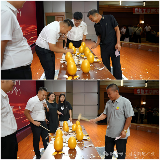 會議高潮由孫彥凱總經(jīng)理親自帶來。他現(xiàn)場發(fā)布了極具吸引力的專屬合作政策與重磅優(yōu)惠方案,并正式啟動合作意向金的收取及“砸金蛋贏豪禮”活動。豐厚的政策支持和激動人心的互動環(huán)節(jié)瞬間引爆全場,合作伙伴們積極響應(yīng),踴躍交納意向金,爭相上臺參與砸金蛋,將現(xiàn)場氣氛推向頂點。此環(huán)節(jié)極大激發(fā)了合作伙伴的信心與熱情,現(xiàn)場訂貨踴躍,充分彰顯了市場對“浚黎99”的高度認(rèn)可及對商道種業(yè)未來發(fā)展的一致看好。