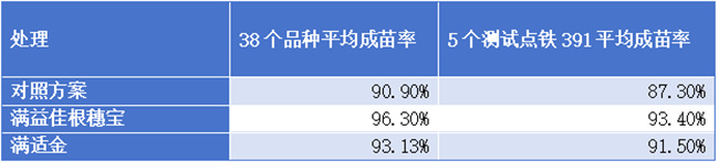 2025年基于38個品種的田測數(shù)據(jù)表明,滿益佳根穗寶方案成苗率平均達到96.3%,較對照方案出苗率高出5.4%。5個測試點鐵391平均成苗率比對照方案高出6.1%。