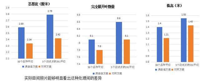 小喇叭口期進行莖基寬、完全展開葉數(shù)量和株高調(diào)查,每個品種每個處理取20株進行測量統(tǒng)計(中間4壟每壟連續(xù)取樣5株),最后計算平均值,結(jié)果表明滿益佳根穗寶方案各指標都高于對照,這表明滿益佳根穗寶方案在小喇叭口期依然能表現(xiàn)出明顯優(yōu)勢。