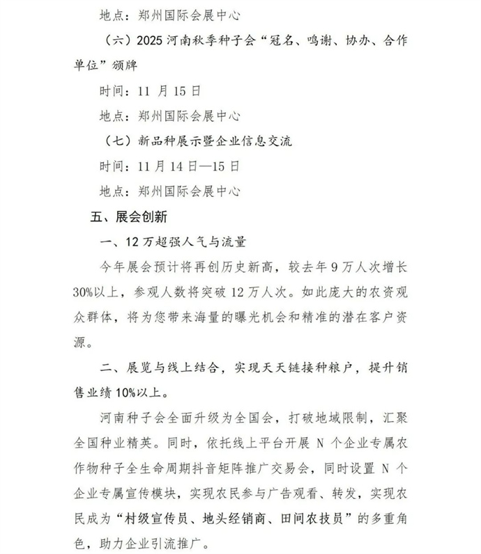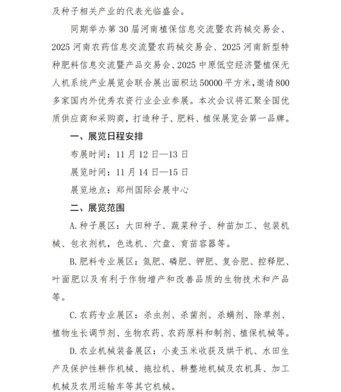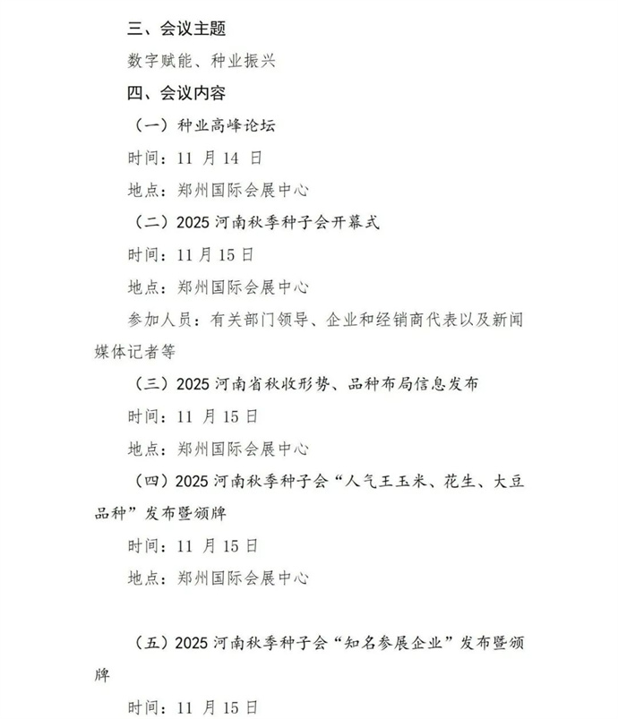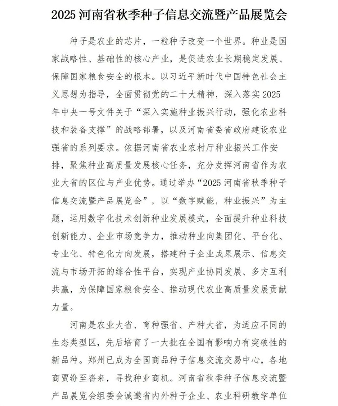為推動種業(yè)高質(zhì)量發(fā)展,助力農(nóng)業(yè)現(xiàn)代化進(jìn)程,“2025河南省秋季種子信息交流暨產(chǎn)品展覽會”將于2025年11月14日至15日在鄭州市國際會展中心隆重舉行。
