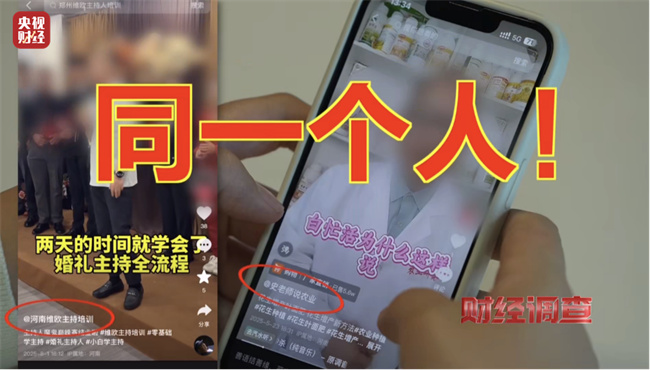 通過調(diào)查發(fā)現(xiàn),同樣以“祥禾農(nóng)業(yè)”為頭像標(biāo)識,并且虛假宣傳銷售“科沃華花生膨大粒粒飽”的賬號“史老師說農(nóng)業(yè)”,出鏡者竟然和另一個名為“河南維歐主持培訓(xùn)”的賬號出鏡者是同一個人。