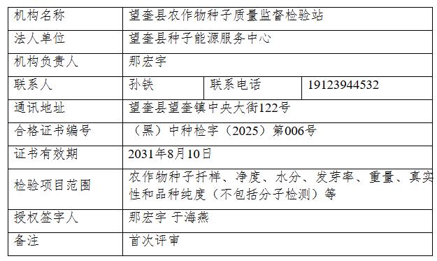 根據(jù)《中華人民共和國(guó)種子法》《農(nóng)作物種子質(zhì)量檢驗(yàn)機(jī)構(gòu)考核管理辦法》等有關(guān)規(guī)定,經(jīng)我廳組織專家進(jìn)行評(píng)審,望奎縣農(nóng)作物種子質(zhì)量監(jiān)督檢驗(yàn)站、海倫市農(nóng)作物種子質(zhì)量監(jiān)督檢驗(yàn)站等2家種子檢驗(yàn)機(jī)構(gòu)具備對(duì)外開(kāi)展農(nóng)作物種子檢驗(yàn)的基本條件和能力,批準(zhǔn)為合格種子檢驗(yàn)機(jī)構(gòu),頒發(fā)《中華人民共和國(guó)農(nóng)作物種子質(zhì)量檢驗(yàn)機(jī)構(gòu)合格證書》,準(zhǔn)許在批準(zhǔn)的種子檢驗(yàn)項(xiàng)目范圍內(nèi)使用農(nóng)作物種子質(zhì)量檢驗(yàn)機(jī)構(gòu)合格標(biāo)志。