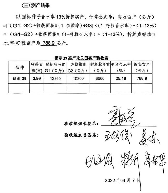 揚(yáng)麥39多抗、高產(chǎn),頗受經(jīng)銷商和種植大戶青睞。2022年6月,中種公司委托江蘇省農(nóng)業(yè)技術(shù)推廣總站組織有關(guān)專家,對(duì)東臺(tái)市黃海原種場(chǎng)種植的揚(yáng)麥39高產(chǎn)攻關(guān)田進(jìn)行了測(cè)產(chǎn)驗(yàn)收,折算成標(biāo)準(zhǔn)含水率籽粒畝產(chǎn)為788.9公斤,刷新了長(zhǎng)江中下游地區(qū)小麥高產(chǎn)紀(jì)錄。正式推廣第二年當(dāng)年,揚(yáng)麥39推廣面積高達(dá)200多萬(wàn)畝,創(chuàng)長(zhǎng)江中下游地區(qū)小麥新品種推廣記錄。