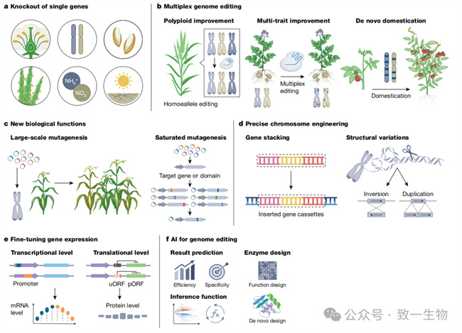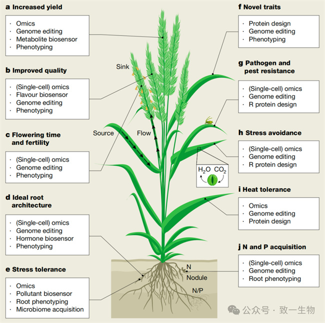 在此基礎(chǔ)上,文章詳細(xì)論述了實現(xiàn)作物改良的強(qiáng)大工具。以CRISPR為代表的基因組編輯技術(shù),已能夠?qū)崿F(xiàn)對作物基因組開展高效、精準(zhǔn)的定向修飾,其跨尺度、多維度的基因組設(shè)計能力將顯著縮短育種周期,快速創(chuàng)造和聚合優(yōu)良性狀。不僅如此,AI驅(qū)動的蛋白質(zhì)設(shè)計技術(shù)正在興起,它能夠從頭創(chuàng)造出自然界中不存在的、具有特定功能的全新蛋白質(zhì)。這為開發(fā)新型抗病蛋白、實時監(jiān)測作物健康的生物傳感器或降解環(huán)境污染物的特制酶提供了可能,從而賦予作物突破性的新功能。