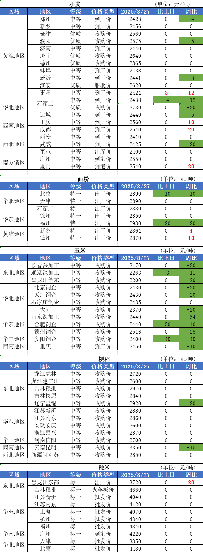 1、8月27日,小麥加工企業(yè)收購(gòu)價(jià)格局部下跌,下跌區(qū)域集中在山東、河北,跌幅多在2-3厘。據(jù)市場(chǎng)反饋,主產(chǎn)省托市收購(gòu)小麥總量超過1000萬(wàn)噸,收購(gòu)庫(kù)點(diǎn)約500家,有利得支撐著麥價(jià)底部,近期下游面粉消費(fèi)有所好轉(zhuǎn),麥價(jià)下跌幅度放緩。
