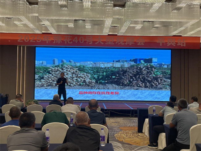 隨后,豫研公司白老師詳解了花生的特征特性,從豫花40號(hào)具有早熟(疏枝直立型品種,生育期110-115天)高產(chǎn)(百果重229.2g、百仁重85.5g)、出米率高(出仁率75%)、抗病性強(qiáng)(抗根腐病病、網(wǎng)斑病、莖腐病、中抗葉斑病、病毒?。⑦m應(yīng)性廣(東北、內(nèi)蒙、河南、湖南)等特點(diǎn)詳細(xì)講解。使經(jīng)銷商、種植大戶對(duì)豫花40號(hào)有了更深入的了解,提高了推廣信心。