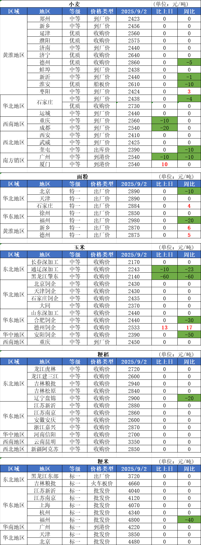 1、9月2日,小麥市場價格漲跌震蕩,經(jīng)過兩天的小范圍翻紅,部分企業(yè)報價又重回下行通道。受下游實際消費持續(xù)低迷制約,小麥價格上漲缺乏持續(xù)動力支撐,市場再度陷入供需拉鋸狀態(tài)。