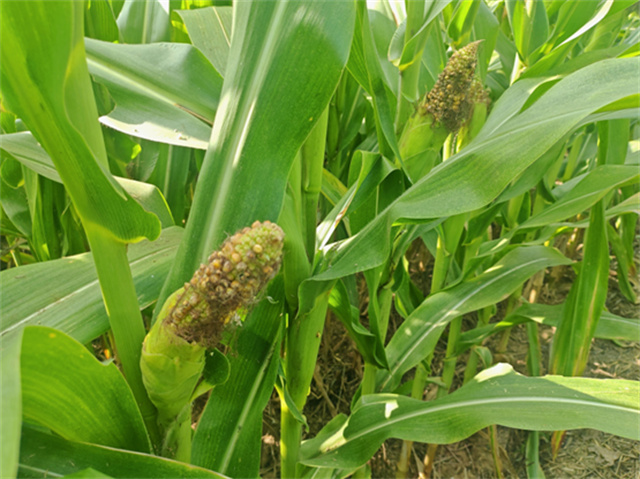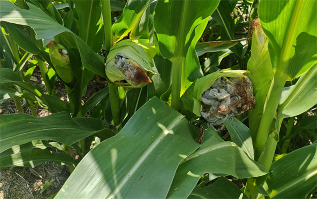 拔節(jié)至抽雄期遭遇高溫干旱,雌穗發(fā)育受阻,苞葉生長滯后于穗軸,形成“超短裙”。果穗裸露不僅影響灌漿,也為穗部害蟲與真菌侵染創(chuàng)造條件,降低產(chǎn)量和品質(zhì)。