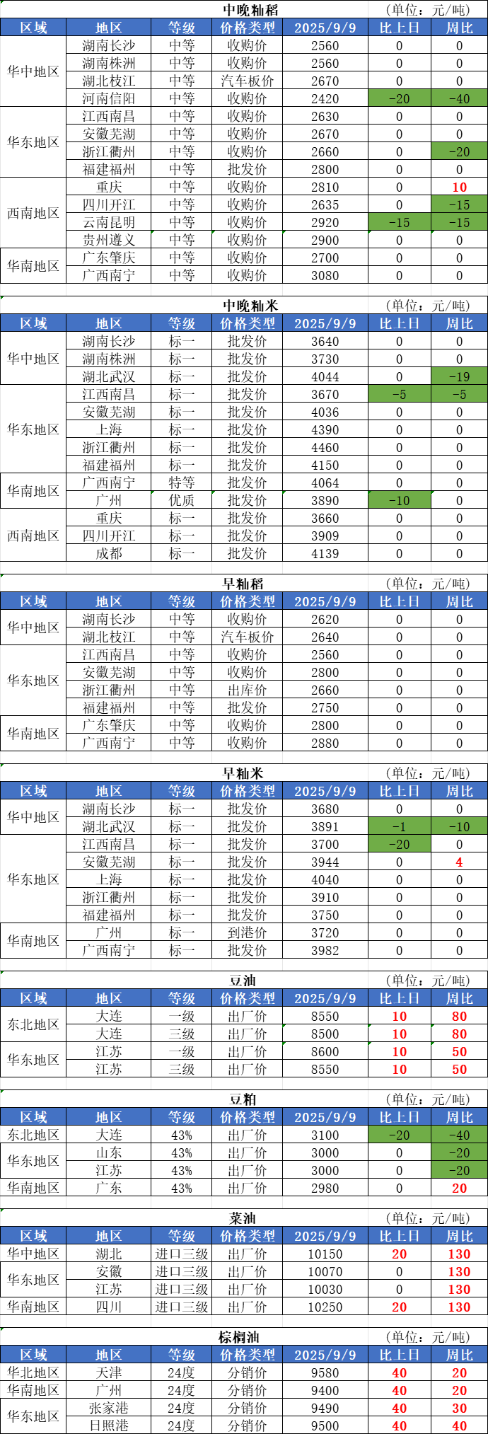 3、截至9月5日,江西省累計(jì)收購(gòu)新季早稻80.3億斤,同比增加15.6億斤。其中,國(guó)有企業(yè)收購(gòu)25.7億斤,其他企業(yè)收購(gòu)54.6億斤。目前收購(gòu)價(jià)格保持穩(wěn)定,長(zhǎng)粒型早稻價(jià)格在128-132元/百斤,圓粒型早稻價(jià)格在128-135元/百斤。