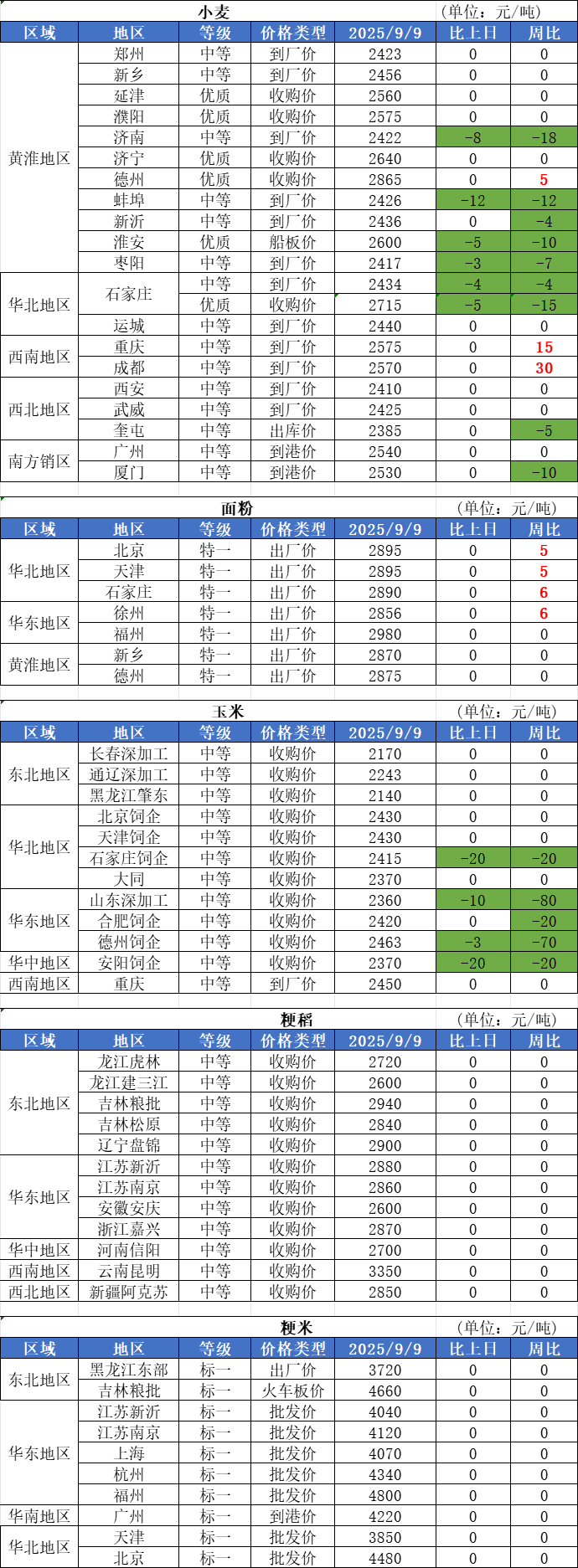 1、9月9日,小麥市場(chǎng)價(jià)格整體跌多漲少,落價(jià)區(qū)域主要集中在山東、河北等地,河南部分面企漲價(jià),調(diào)整幅度在2-6厘。山東個(gè)別企業(yè)已經(jīng)跌破1.21元/斤,越來(lái)越多的企業(yè)收購(gòu)價(jià)格向1.21元/斤逼近。
