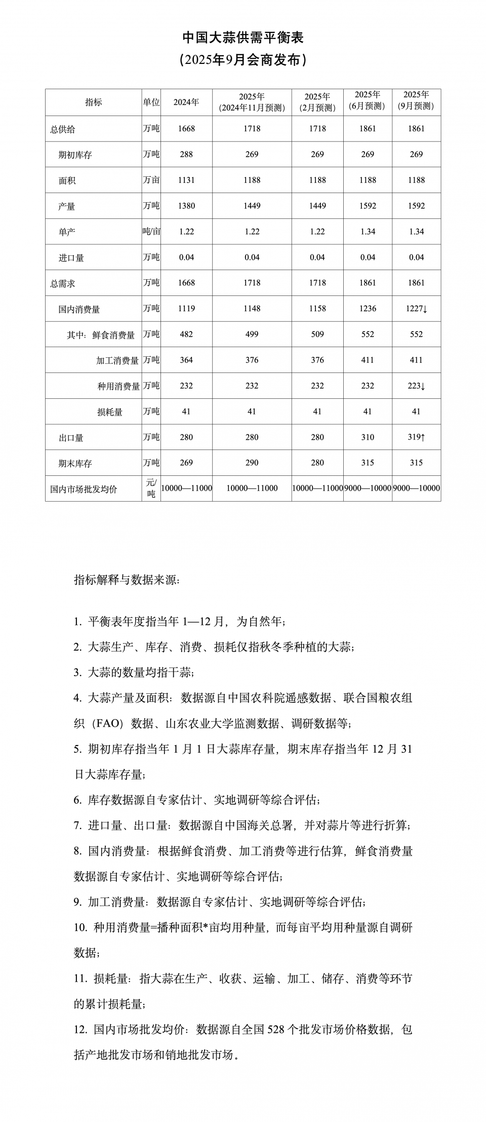 編者按:為探索形成以市場信息引導農(nóng)產(chǎn)品產(chǎn)銷平衡的機制,農(nóng)業(yè)農(nóng)村部市場與信息化司聯(lián)合大蒜產(chǎn)業(yè)鏈市場主體,組建了大蒜市場分析預警團隊,定期會商發(fā)布大蒜供需平衡表。目前,2025年大蒜已完成收獲入庫。農(nóng)業(yè)農(nóng)村部市場與信息化司聯(lián)合中國氣象局等部門和大蒜產(chǎn)業(yè)鏈主體會商研判近期大蒜生產(chǎn)和市場形勢,動態(tài)調(diào)整大蒜供需平衡表,形成了系列專題報告,現(xiàn)摘編發(fā)布,供業(yè)界參考。