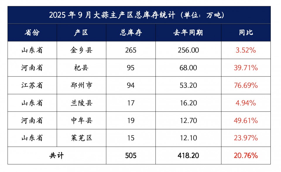 庫存情況。供應量,2025年山東省42個主產(chǎn)縣的大蒜收獲面積為264.36萬畝,產(chǎn)量為330萬噸左右。庫存量,2025年9月1日大蒜主產(chǎn)區(qū)庫存量為510萬噸左右。其中,山東省庫存量為305萬噸左右(金鄉(xiāng)產(chǎn)區(qū)273萬噸左右、蘭陵產(chǎn)區(qū)17萬噸左右、萊蕪產(chǎn)區(qū)15萬噸左右)。
