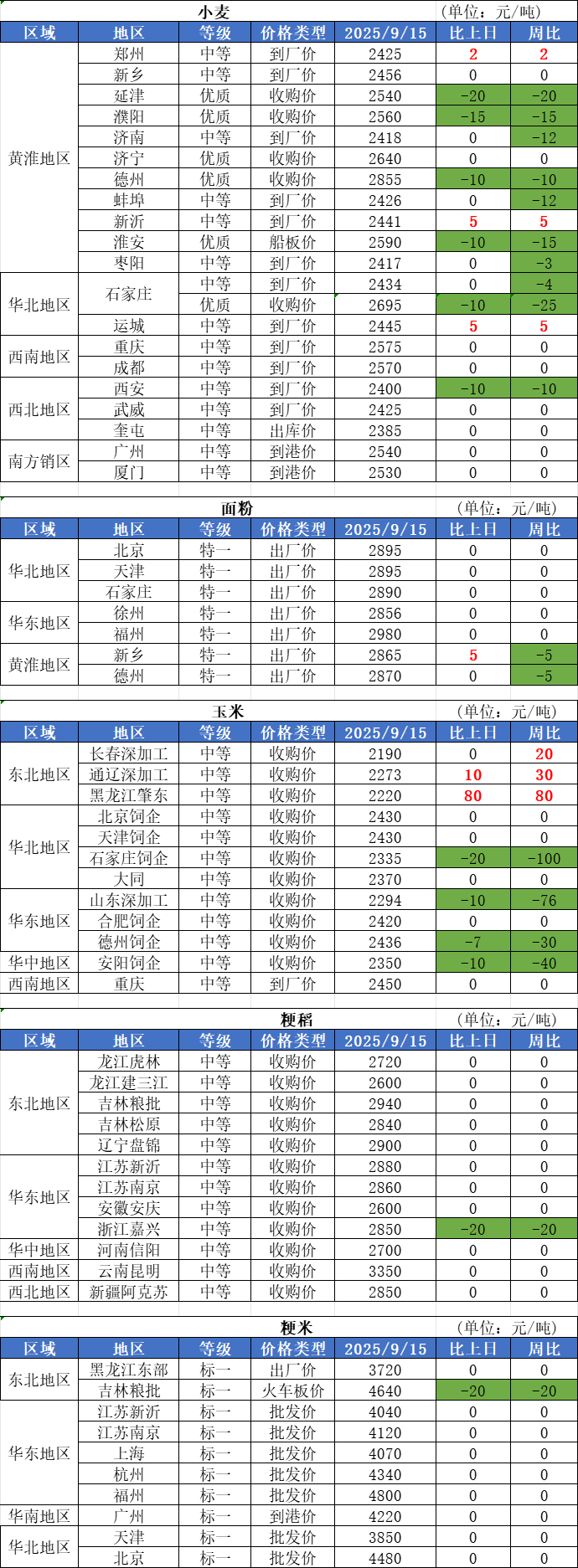 1、9月15日,小麥加工企業(yè)收購價格穩(wěn)中偏強,山東、河北、河南、江蘇等地企業(yè)不同程度的上調(diào)收購價,漲幅在2-6厘之間。受上周降雨天氣影響,部分廠家上量偏少,低庫存運作策略下有補庫需求,支撐價格上行。