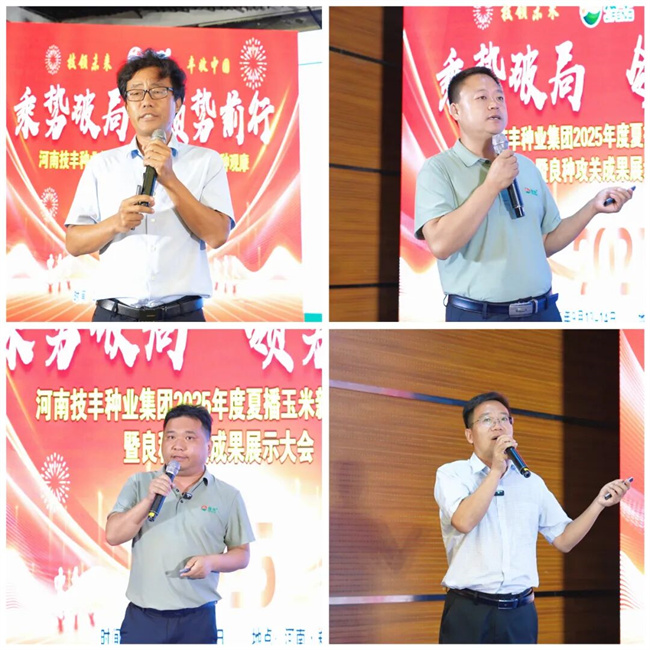 在“優(yōu)良玉米品種推介”環(huán)節(jié),技豐種業(yè)集團(tuán)副總經(jīng)理李繼清、富吉泰種業(yè)總經(jīng)理助理衡紅剛、大成種業(yè)總經(jīng)理助理崔秋偉、金北種業(yè)總經(jīng)理朱建偉依次上臺(tái),詳細(xì)介紹各自公司的創(chuàng)新品種與主推產(chǎn)品。