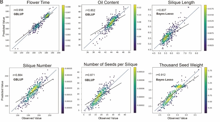 科研人員經(jīng)過研究,打造出高準(zhǔn)確度基因組預(yù)測模型,該模型像“基因組導(dǎo)航儀”,通過全基因組關(guān)聯(lián)分析找到控制關(guān)鍵性狀的基因遺傳變異,這些遺傳變異猶如“基因路標(biāo)”,能精準(zhǔn)預(yù)測油菜生長表現(xiàn)。實(shí)驗(yàn)數(shù)據(jù)顯示,該模型對開花時間和千粒重的預(yù)測準(zhǔn)確率突破90%,含油量、角果長度等性狀準(zhǔn)確率超83%。