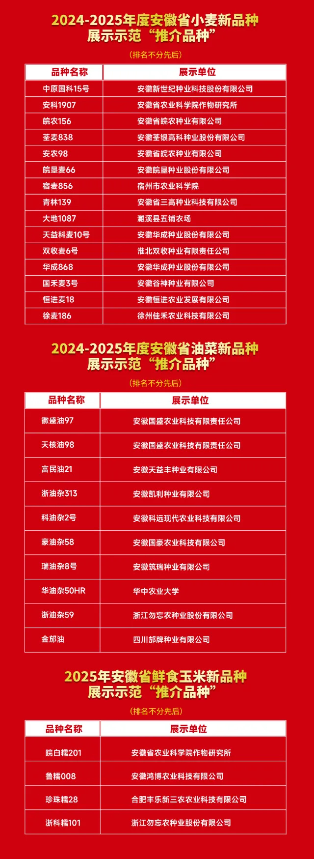 會(huì)上,安徽省農(nóng)業(yè)科學(xué)院水稻研究所所長(zhǎng)倪大虎宣讀《安徽省2025年水稻新品種展示示范推介品種初選入圍名單》,安徽省種子協(xié)會(huì)秘書(shū)長(zhǎng)葉飛宣讀《安徽省2025年玉米、大豆新品種展示示范推介品種初選入圍名單》。為推進(jìn)農(nóng)作物育種成果轉(zhuǎn)化,加快高產(chǎn)、優(yōu)質(zhì)、綠色、高效農(nóng)作物新品種推廣應(yīng)用,對(duì)安徽省2024-2025年度遴選出的15個(gè)小麥推介品種、10個(gè)油菜推介品種和2025年4個(gè)鮮食玉米推介品種頒發(fā)了證書(shū)(品種名單見(jiàn)附件)。