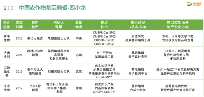 舜豐生物、齊禾生科、艾迪晶生物、未米生物等“四小龍”快速崛起,這幾家企業(yè)聚焦于作物育種和生物技術研發(fā),依托自主可控的基因編輯工具體系,不僅在關鍵技術環(huán)節(jié)實現(xiàn)了突破,還在市場應用端展現(xiàn)出強勁潛力。