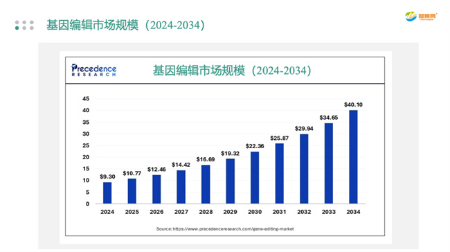 2022年被譽為“中國生物育種元年”,政策與資本雙雙加碼生物育種賽道。據(jù)統(tǒng)計,2024年全球基因編輯市場規(guī)模已達93億美元,預計將從2025年的107.7億美元增長至2034年的401億美元,期間復合年增長率高達15.74%。