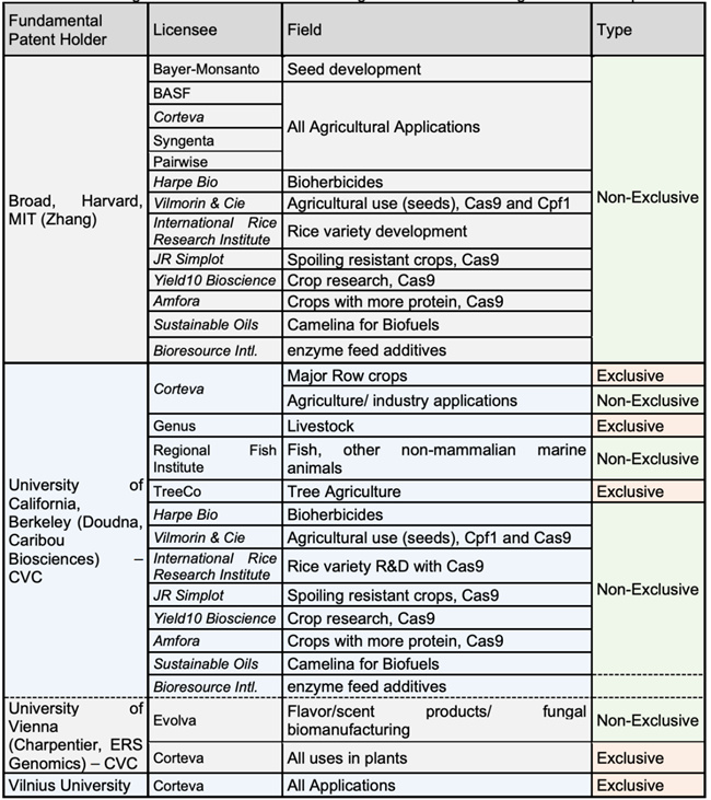 從專利格局看,科迪華(Corteva)憑借從 Broad、加州大學伯克利分校(CVC)、維也納大學、維爾紐斯大學等處獲得的大宗作物及植物全應用的獨占許可,再加上廣泛的非獨占授權,已在農(nóng)業(yè)基因編輯領域構筑起強大的專利壁壘,掌握著全球產(chǎn)業(yè)競爭的主導權。相比之下,拜耳-孟山都、先正達、巴斯夫等巨頭則更多聚焦特定作物或應用場景,而 Vilmorin、國際水稻研究所、JR Simplot 等機構則深耕特色作物與性狀改良。