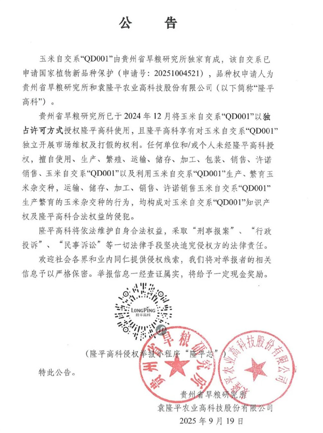 日前,袁隆平農(nóng)業(yè)高科技股份有限公司(下稱“隆平高科”)發(fā)布聲明稱,貴州省旱糧研究所已于2024年12月將玉米自交系“QD001”以獨占許可方式授權(quán)隆平高科使用,且隆平高科享有對玉米自交系“QD001”獨立開展市場維權(quán)及打假的權(quán)利。