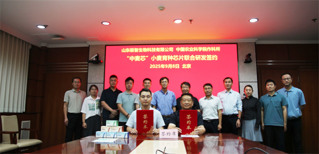 日前,中國農(nóng)業(yè)科學(xué)院作物科學(xué)研究所與山東極智生物科技有限公司在北京簽署“中麥芯”小麥育種芯片聯(lián)合研發(fā)合作協(xié)議。作科所小麥基因資源與利用創(chuàng)新研究組郝晨陽研究員與極智生物創(chuàng)始人焦成智分別代表雙方簽約。