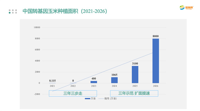2024年中央一號(hào)文件明確提出“轉(zhuǎn)基因產(chǎn)業(yè)化擴(kuò)面提速”,在此政策推動(dòng)下,今年轉(zhuǎn)基因作物種植已擴(kuò)展至8個(gè)省份,面積約1065萬(wàn)畝;2025年,轉(zhuǎn)基因玉米將進(jìn)一步開拓更多區(qū)域市場(chǎng)。目前全國(guó)已有黑龍江、吉林、內(nèi)蒙古、遼寧、河北、山東、河南、安徽、四川、云南、廣西、甘肅、江蘇等十三個(gè)省份獲準(zhǔn)種植轉(zhuǎn)基因玉米,其中吉林、內(nèi)蒙古、遼寧、河北全省開放。預(yù)計(jì)2025年種植面積約3100萬(wàn)畝,2026年常規(guī)化種植規(guī)模有望突破8000萬(wàn)畝,逐步實(shí)現(xiàn)“農(nóng)民會(huì)種、政府會(huì)管、企業(yè)會(huì)推”的常態(tài)化種植目標(biāo)。