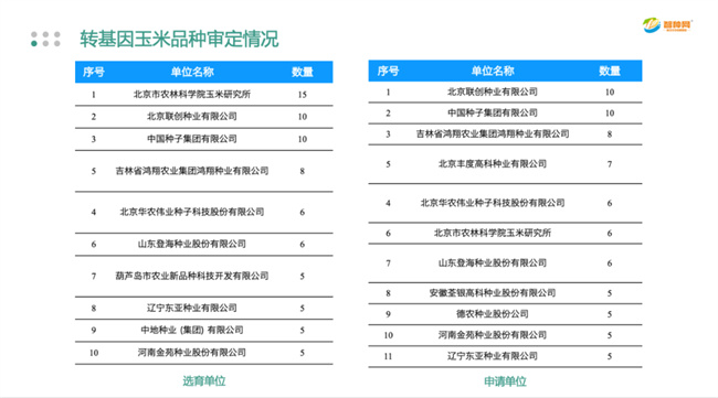 在轉(zhuǎn)基因玉米品種審定方面,國(guó)內(nèi)企業(yè)積極參與并取得了顯著突破。截至目前,已有37家種業(yè)公司獲得轉(zhuǎn)基因玉米品種的生產(chǎn)經(jīng)營(yíng)許可。申請(qǐng)主體構(gòu)成上,共有 66家單位提交申請(qǐng),其中種業(yè)公司56家、科研院所10家;其中,北京市農(nóng)林科學(xué)院玉米研究所申請(qǐng)數(shù)量最多,達(dá)15個(gè)。從選育主體來(lái)看,共有 69家單位參與品種申請(qǐng),種業(yè)公司65家、科研院所4家,北京聯(lián)創(chuàng)種業(yè)與中國(guó)種子集團(tuán)并列第一,各提交10個(gè)申請(qǐng)。