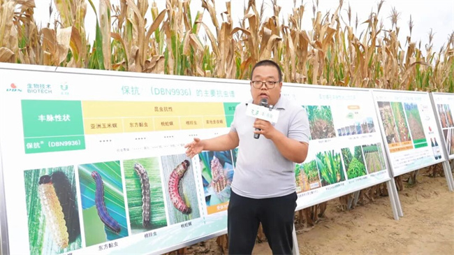 隨后,大北農(nóng)生物技術(shù)應(yīng)用部袁輝老師通過展板介紹了豐脈性狀的技術(shù)優(yōu)勢(shì),尤其是抗蟲和耐草甘膦特性。根據(jù)黃淮海地區(qū)多年試點(diǎn)與示范數(shù)據(jù),轉(zhuǎn)育了“豐脈??笵BN9936”性狀的品種,相比其受體品種在產(chǎn)量保護(hù)、糧質(zhì)提升、農(nóng)藥減量和勞動(dòng)力節(jié)約等方面綜合收益顯著,每畝地可為農(nóng)戶增加200元以上的效益。
