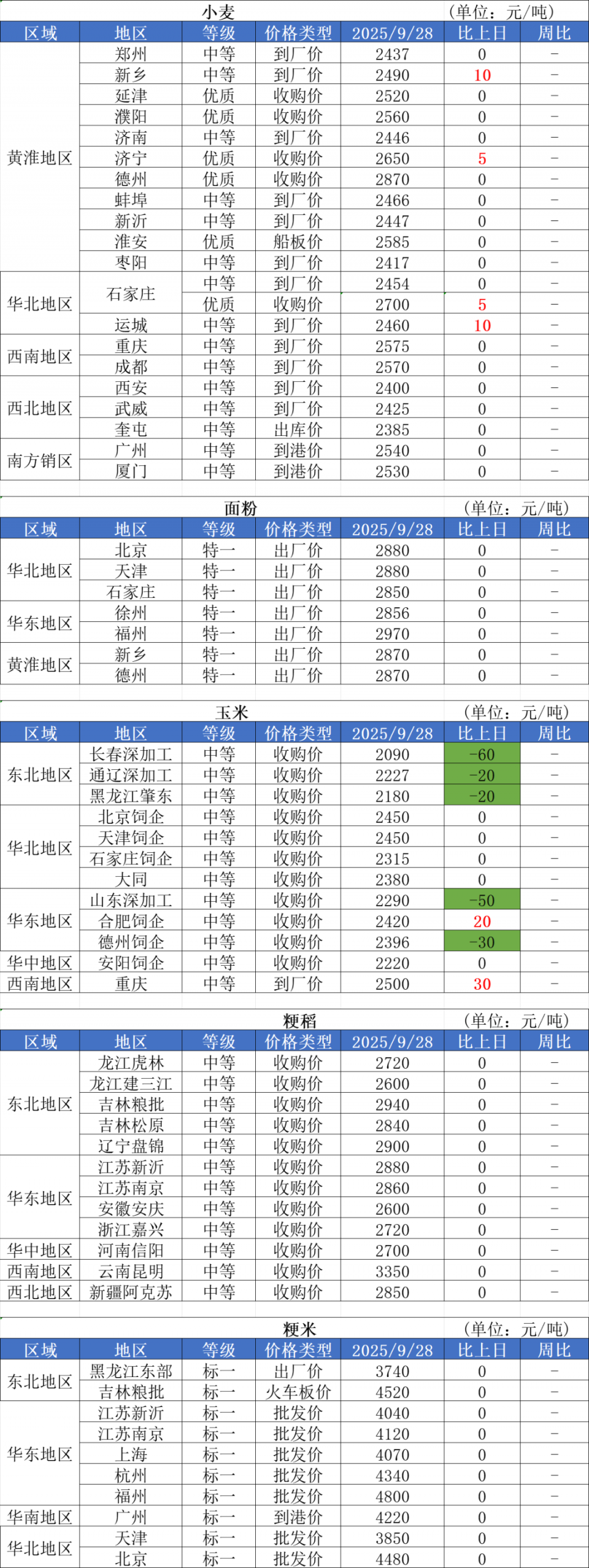 1、9月28日,小麥加工企業(yè)收購價格延續(xù)震蕩偏強走勢,調(diào)整幅度在2-5厘,漲價區(qū)域集中于山東、安徽、陜西等地。近期華北陰雨天氣持續(xù),小麥流通不便,同時市場擔(dān)憂新季玉米質(zhì)量,小麥?zhǔn)袌鰞r格延續(xù)偏強趨勢。