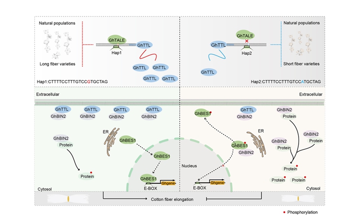 該研究明確了支架蛋白GhTTL是棉纖維伸長的關(guān)鍵正調(diào)控因子,發(fā)現(xiàn)啟動子區(qū)域的自然多態(tài)性顯著影響上游轉(zhuǎn)錄因子對其的結(jié)合親和力,從而調(diào)節(jié)該蛋白在不同棉花品種中的表達(dá)水平。