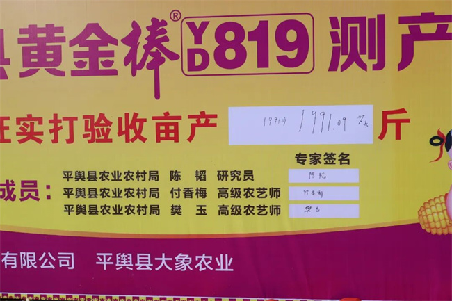 在嚴(yán)格遵循測(cè)產(chǎn)程序的前提下,專家組進(jìn)行了實(shí)打?qū)嵤蘸途_測(cè)算。最終折合14%標(biāo)準(zhǔn)水分后,平輿縣農(nóng)業(yè)農(nóng)村局高級(jí)農(nóng)藝師付香梅正式宣布:黃金棒YD819畝產(chǎn)毛糧1991.09斤。這一成績(jī)?cè)谑転?zāi)年份尤顯珍貴,充分展示了YD819的穩(wěn)定性與抗逆性。