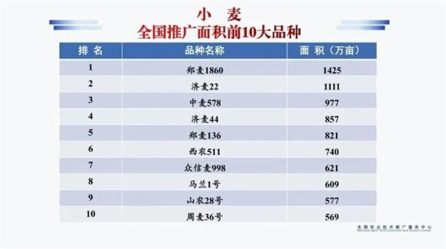 以上2024年全國推廣面積前十大小麥品種,主要體現(xiàn)在綜合抗逆性好,適應(yīng)性廣,高產(chǎn)穩(wěn)產(chǎn)。中麥578和眾信麥998適應(yīng)三生態(tài)區(qū)種植,特別是濟麥22連續(xù)多年,推廣面積排在前列,體現(xiàn)市場受歡迎和認可度。