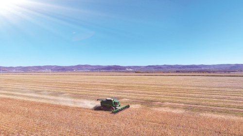 近日,在位于我國最北端、積溫條件極為嚴苛的第六積溫帶上,內(nèi)蒙古呼倫貝爾農(nóng)墾大興安嶺諾敏河農(nóng)牧場種植的1.8萬畝大豆取得了平均畝產(chǎn)378斤的歷史性高產(chǎn)紀錄。通過大力推行保護性耕作技術(shù),增強了黑土地的“體質(zhì)”和保水保肥能力。同時,通過建設(shè)完善的農(nóng)田水利設(shè)施,增強了防災(zāi)減災(zāi)能力,利用大數(shù)據(jù)和現(xiàn)代農(nóng)業(yè)技術(shù)進行精準播種、科學(xué)田管,確保了苗齊苗壯。圖為該農(nóng)牧場正在收割大豆?! ∷嘻慃悺∞r(nóng)民日報·中國農(nóng)網(wǎng)記者 李昊 攝