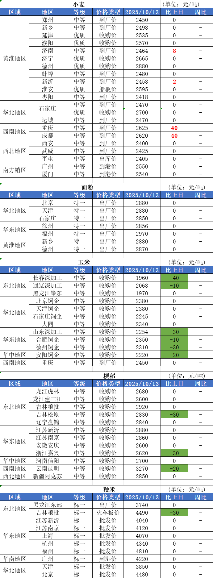 1、10月13日,小麥加工企業(yè)收購價格漲跌互現(xiàn),經(jīng)過前期持續(xù)多日的接連上漲,河北、河南部分企業(yè)今日下調(diào)小麥價格。例如新鄉(xiāng)志情面業(yè)下調(diào)4厘報1.247元/斤,光牌面業(yè)下調(diào)2厘報1.23元/斤,河北金沙河下調(diào)2厘報1.23元/斤。