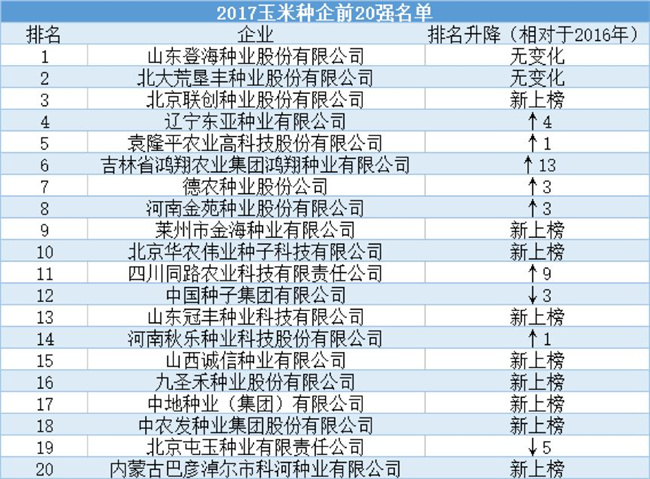 2016發(fā)布的玉米種子銷售前20強(qiáng)名單