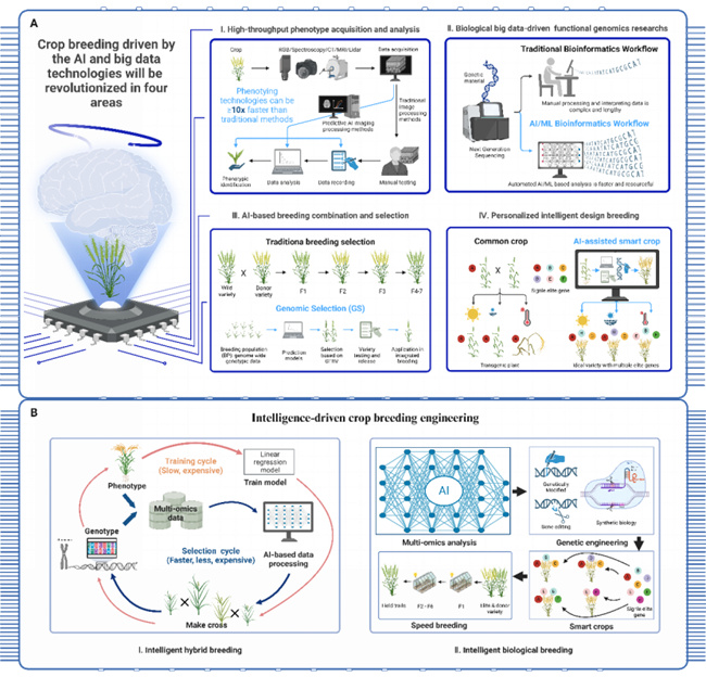 革命性作物育種:下一代人工智能和大數(shù)據(jù)驅(qū)動的智能設(shè)計(jì)育種時(shí)代 (a) 由下一代人工智能和大數(shù)據(jù)技術(shù)驅(qū)動的作物育種將在四個(gè)領(lǐng)域發(fā)生變革:(i) 高通量表型獲取與分析;(ii) 生物大數(shù)據(jù)驅(qū)動的作物功能基因組學(xué)研究;(iii) 基于人工智能的育種組合與選擇;(iv) 個(gè)性化智能設(shè)計(jì)育種。 (b) 未來,生物技術(shù)與信息技術(shù)(BT + IT)的深度融合將推動智能驅(qū)動的作物育種工程發(fā)展,并具有兩個(gè)關(guān)鍵特征:(i) 基于大數(shù)據(jù)和育種模型的智能雜交育種;(ii) 利用人工智能和合成進(jìn)化技術(shù)的智能生物育種。(來源:趙春江院士團(tuán)隊(duì))