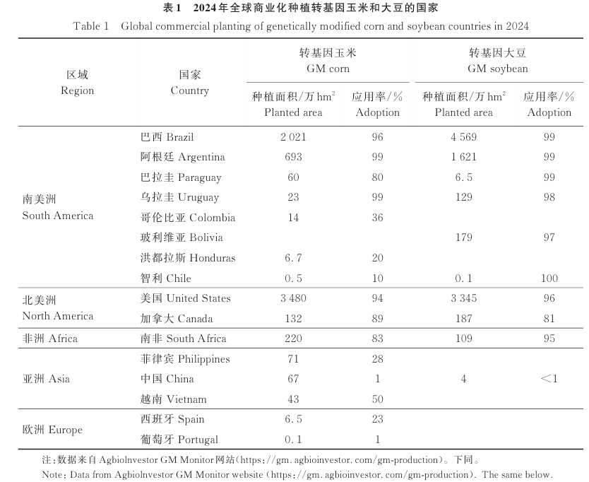 據(jù)Agbiolnvestor GM Monitor網(wǎng)站統(tǒng)計(jì),2024年,美國(guó)、巴西和阿根廷是全球轉(zhuǎn)基因作物種植面積排名前三的國(guó)家,其轉(zhuǎn)基因玉米和大豆的種植面積均占本國(guó)玉米和大豆種植總面積的90%以上;在歐洲,包括法國(guó)、德國(guó)、波蘭、捷克共和國(guó)和羅馬尼亞在內(nèi)的多個(gè)國(guó)家也曾小面積種植轉(zhuǎn)基因玉米。