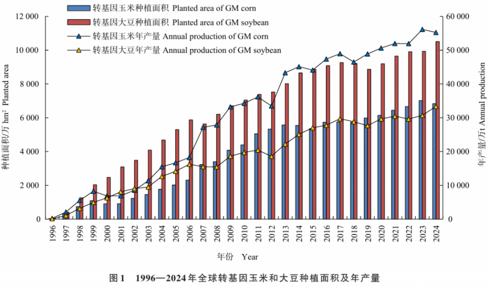 1996—2024年,全球轉(zhuǎn)基因玉米和大豆的種植面積及產(chǎn)量均呈現(xiàn)顯著的增長(zhǎng)趨勢(shì)。