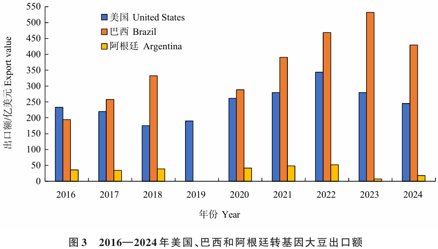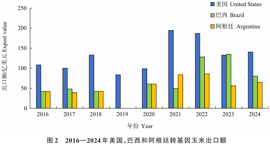 2016—2024年,美國(guó)、巴西及阿根廷轉(zhuǎn)基因玉米和大豆出口額整體呈現(xiàn)波動(dòng)形式。美國(guó)、巴西分別是轉(zhuǎn)基因玉米、大豆最大的出口國(guó),2021年美國(guó)轉(zhuǎn)基因玉米出口額為194.56億美元,2023年巴西轉(zhuǎn)基因大豆出口額更是高達(dá)532.35億美元。