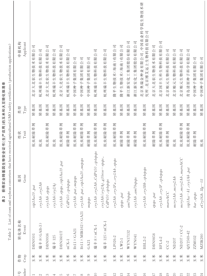 轉(zhuǎn)基因玉米品種的轉(zhuǎn)化體來源主要包括:"DBN9936""瑞豐125""ND207"Bt11×GA21""Bt11×MIR162×GA21""DBN3601T"目標(biāo)性狀主要為抗蟲及耐除草劑,其中主要抗蟲類型有抗亞洲玉米螟、抗黏蟲及抗棉鈴蟲。轉(zhuǎn)基因大豆品種轉(zhuǎn)化體來源主要為"DBN9004"和"中黃6106",目標(biāo)性狀為耐除草劑。