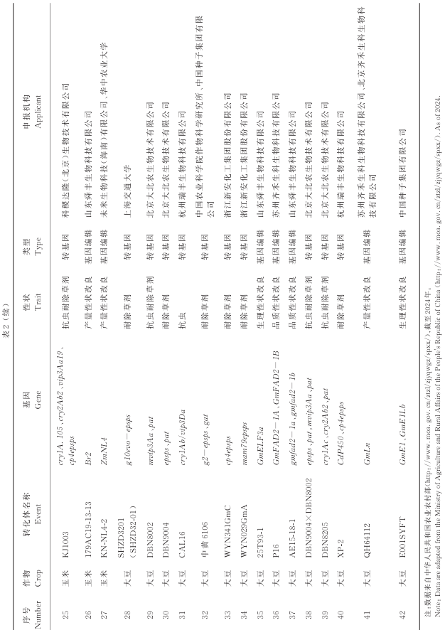 2023年10月17日,中華人民共和國(guó)農(nóng)業(yè)農(nóng)村部在第五屆國(guó)家農(nóng)作物品種審定委員會(huì)第四次審定會(huì)議上初審?fù)ㄟ^了37個(gè)轉(zhuǎn)基因玉米品種和14個(gè)轉(zhuǎn)基因大豆品種,并于2023年12月7日進(jìn)行了公告。